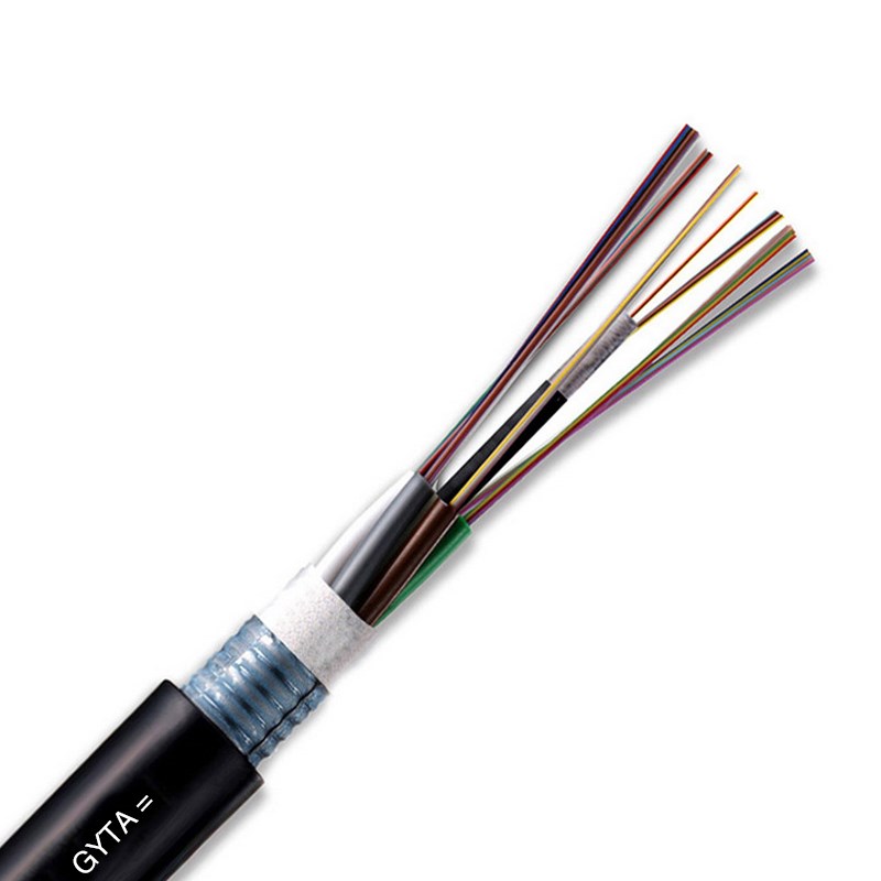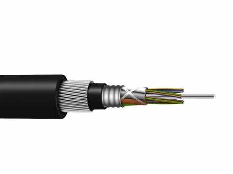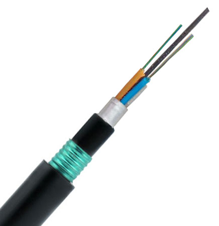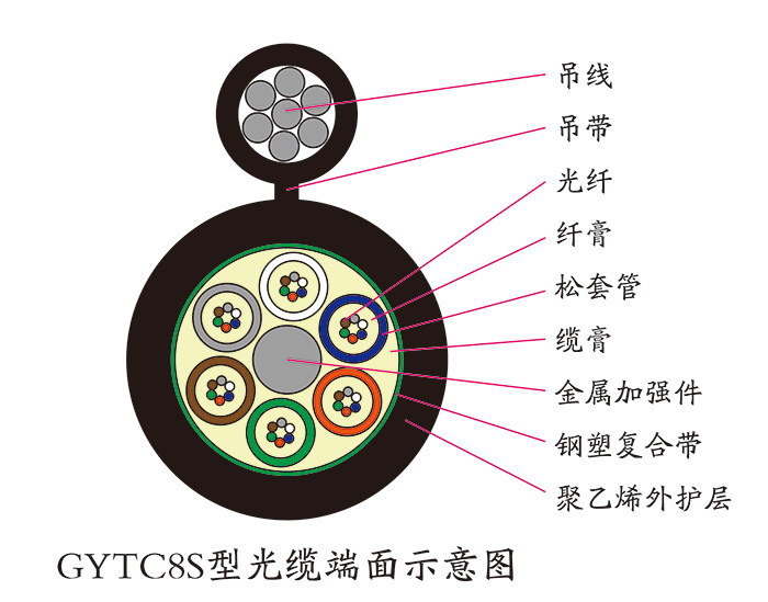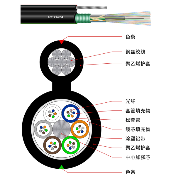 GYTC8A【金属加强构件、松套层绞填充式、铝-聚乙烯粘结护套通信用室外光缆】光缆的结构是将单模或多模光纤套入高模量塑料做成的内填充防水化合物松套管中,缆芯中心是一根金属加强件,对于某些芯数的光缆来说,金属中心加强件外挤包一层聚乙烯。松套管(和填充绳)围绕中心加强件绞合成紧凑和圆整的缆芯,缆芯内缝隙充以阻水化合物外挤包铝-聚乙烯粘结护套,同时加装钢绞线吊带成缆。