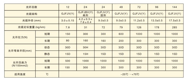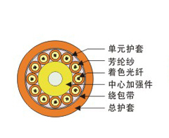 288根着色光纤分成24单元,各单元有独立的芳纶纱增强及护套,配备中心加强件以SZ绞合固定成型