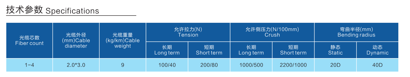 ·两根平行FRP或钢丝具有良好的抗压性能,保护光纤。