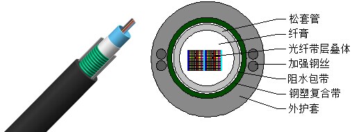 GYXTS 光缆结构是多根单模光纤或多模光纤由高模量的树脂材料经 UV 光固化成为相对位置固定的束状光纤结构,再将多根光纤束套入的松套管中,套管内填充防水化合物。松套管外加阻水材料以保证光缆的纵向渗水,钢丝绕包成缆后双面镀铬涂塑钢带(PSP)纵包, 再在外挤制聚乙烯护套。