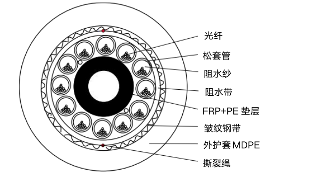 • 一层绕包钢丝保证了光缆的拉伸强度,并有较好的防鼠性能