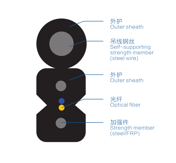 ·单根钢丝或钢绞线附加加强元件,使光缆具有良好的抗拉性能。