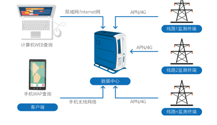监测装置分布安装于输电线路的导线上,对线路的运行情况进行监测,实时采集线路隐患信号并上传到数据中心,经数据中心综合分析可实现线路隐患的自动监测预警和故障的快速精确诊断,通过web和短信两种方式发出告警信息。